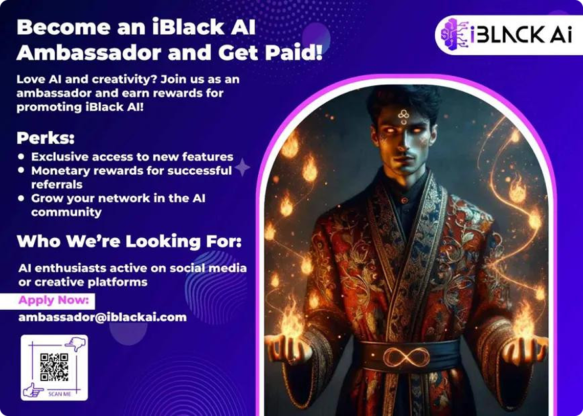 Join us as an ambassador and earn rewards for promoting iBlack AI!